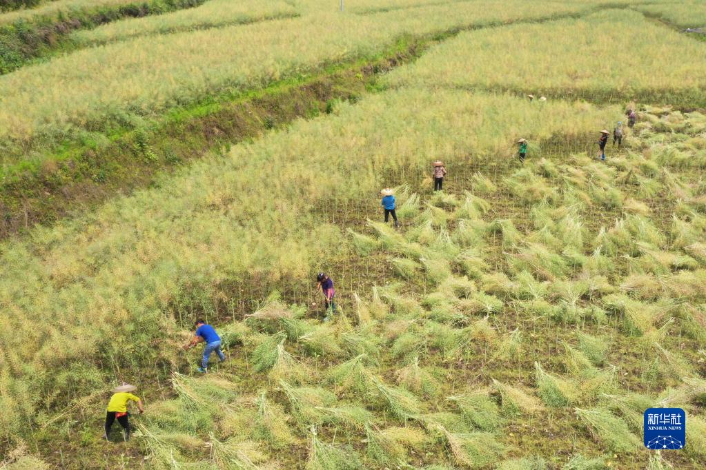 4月26日,村民在贵州省黔东南苗族侗族自治州岑巩县思旸镇盘街村收割油菜(无人机照片)。